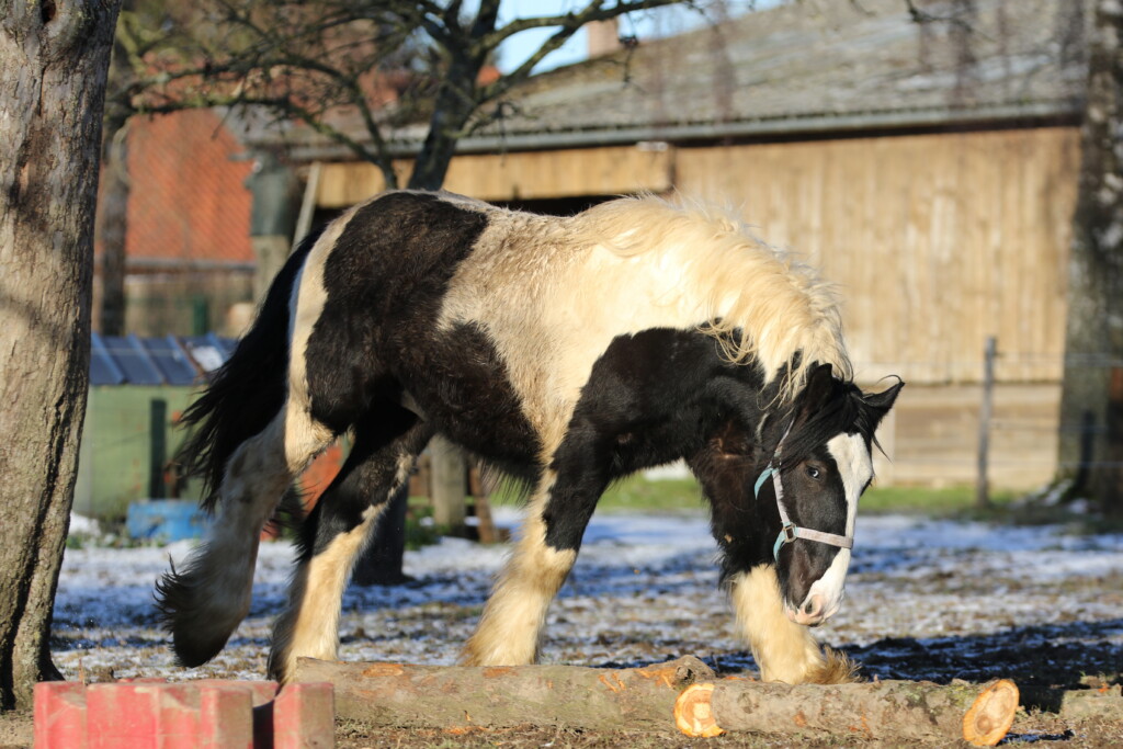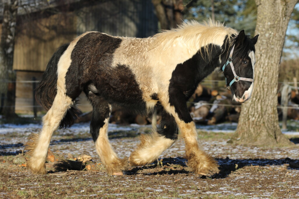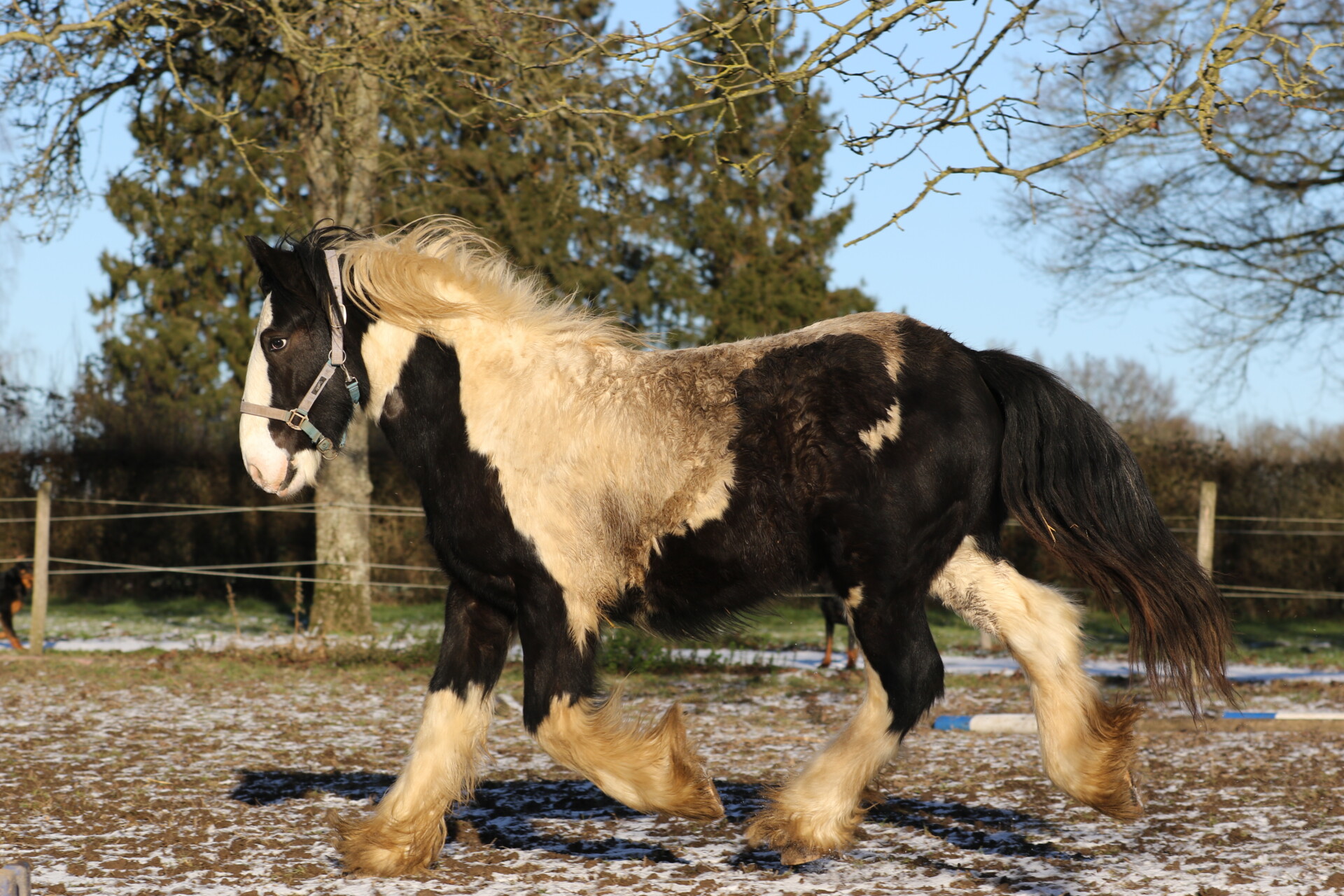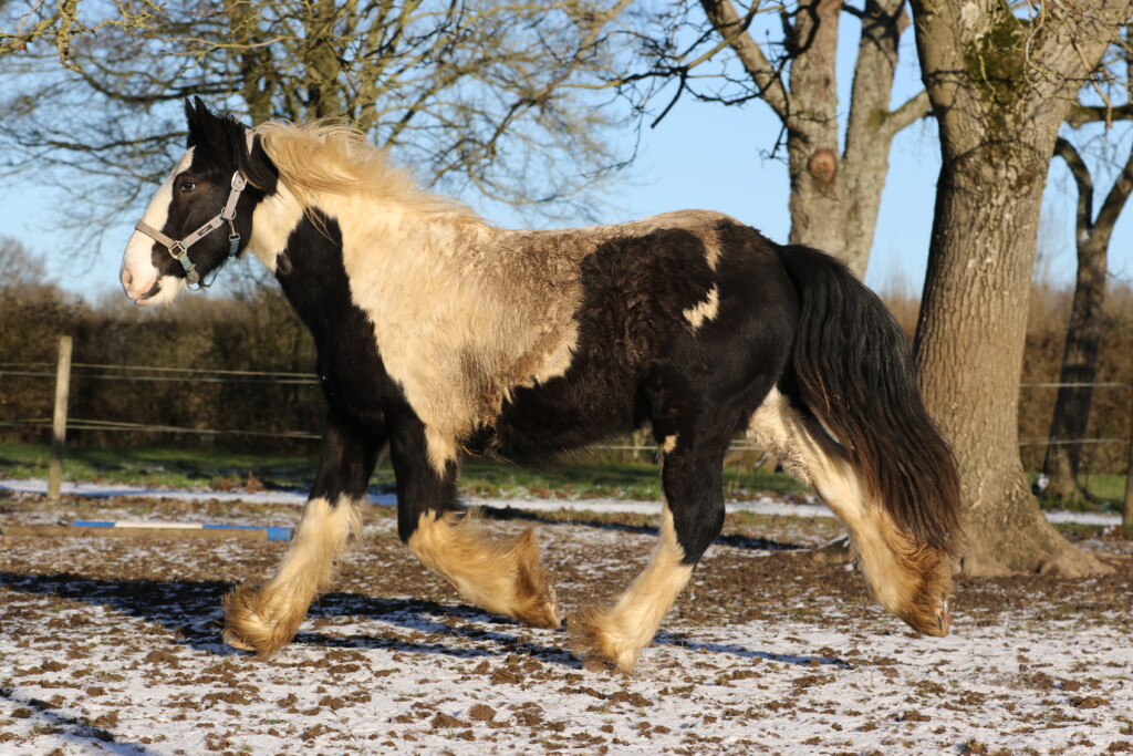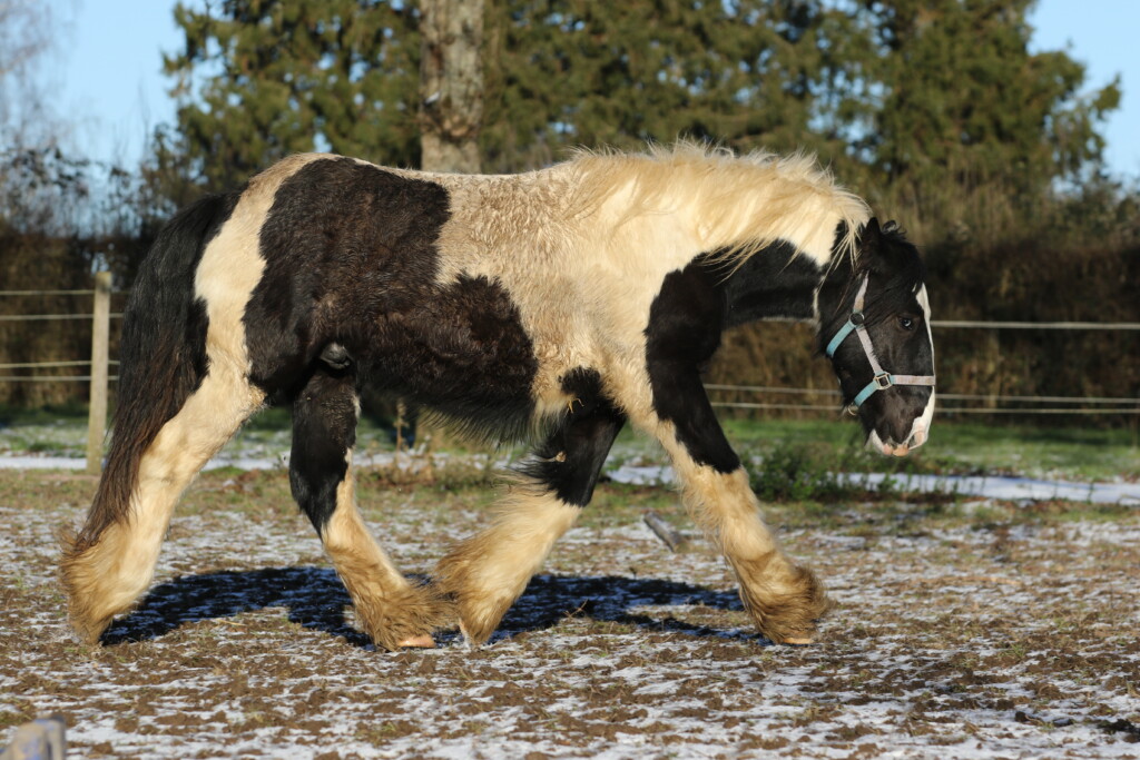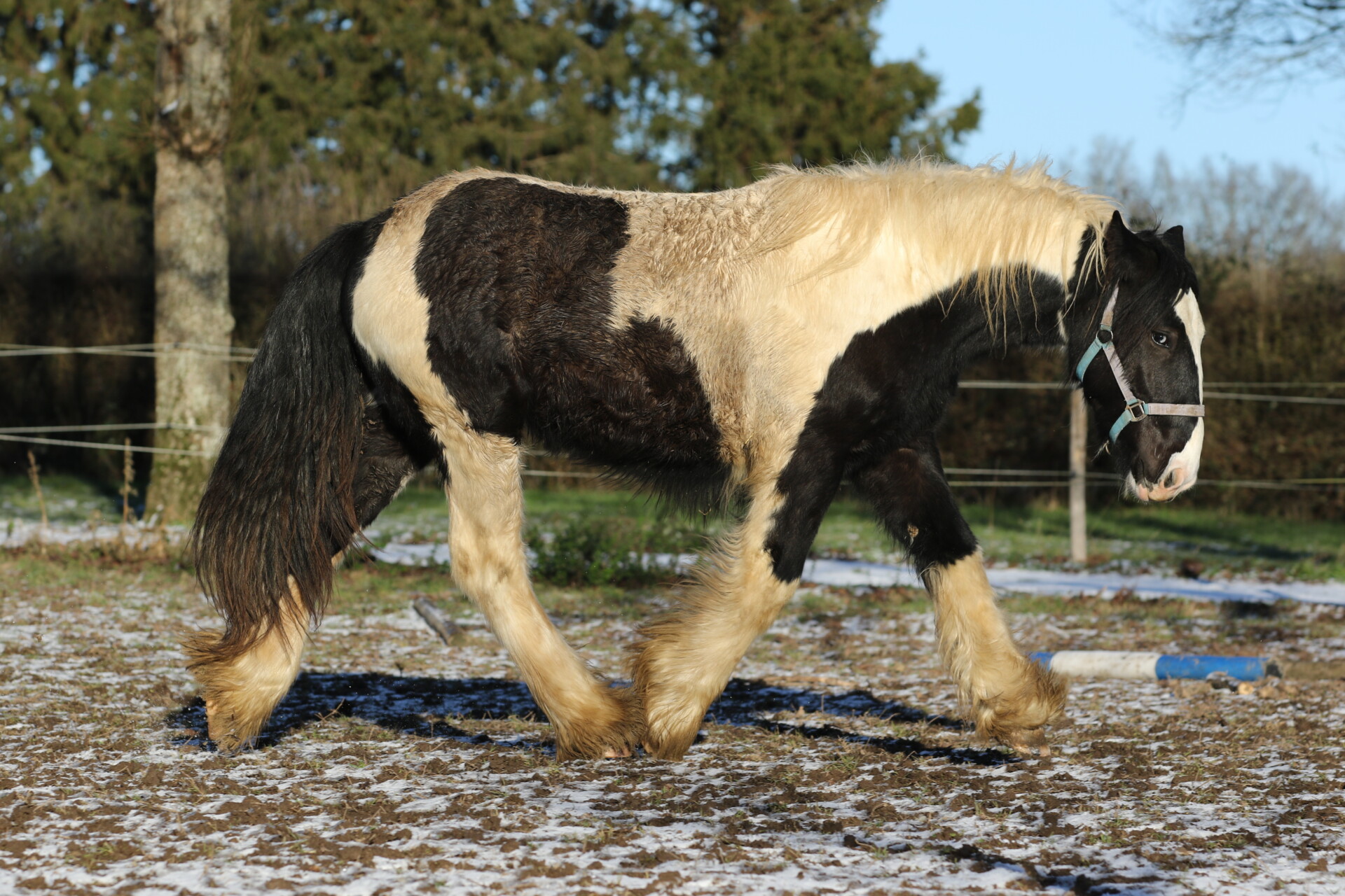 C’est un magnifique modèle traditionnel pie noir, avec beaucoup de présence, de l’os, une vraie prestance… et un regard unique, l’un de ses yeux présentant un léger éclat de bleu qui fait tout son charme.